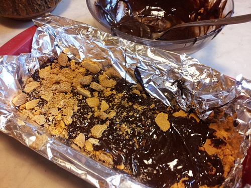 Verser un tiers de cette préparation dans le moule. Attention, il s’agit juste de recouvrir le fond, pas plus ! Puis recouvrir d’une couche de spéculoos, puis verser à nouveau le deuxième tiers de la préparation. Nouvelle couche de biscuits, dernier tiers de chocolat.