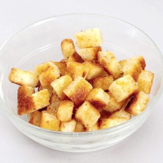 Ingrédients 6 tranches d’une miche de pain découpées en cubes 3 cuillères à soupe de beurre fondu ou d’huile d’olive 1 cuillère à café d’ail en poudre 1 pincée de sel 1 cuillère à...